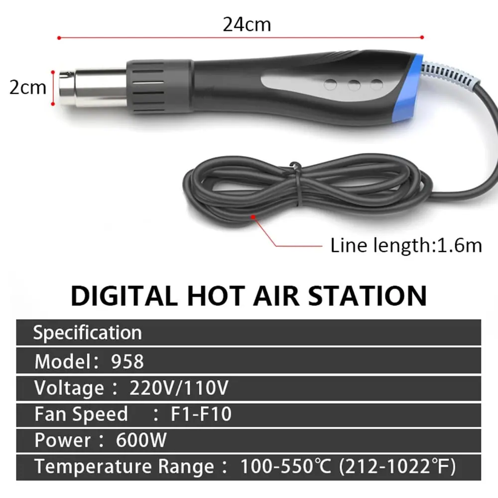 مسدس هواء ساخن محمول موديل 958 بقدرة 600 واط، مثالي لإعادة لحام BGA والمكونات الدقيقة. مزود بتحكم في درجة الحرارة وتدفق الهواء، سهل الاستخدام وفعال في الصيانة.