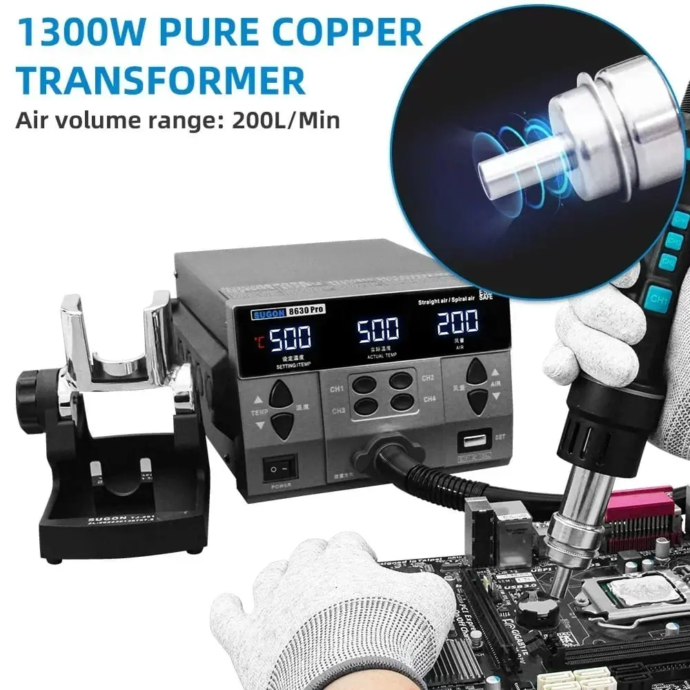 SUGON 8630Pro – محطة لحام احترافية متعددة الوظائف بقدرة 1300 واط، مزودة بشاشة رقمية وتحكم دقيق في الحرارة والهواء. مثالية لأعمال إعادة اللحام على BGA وSMD.