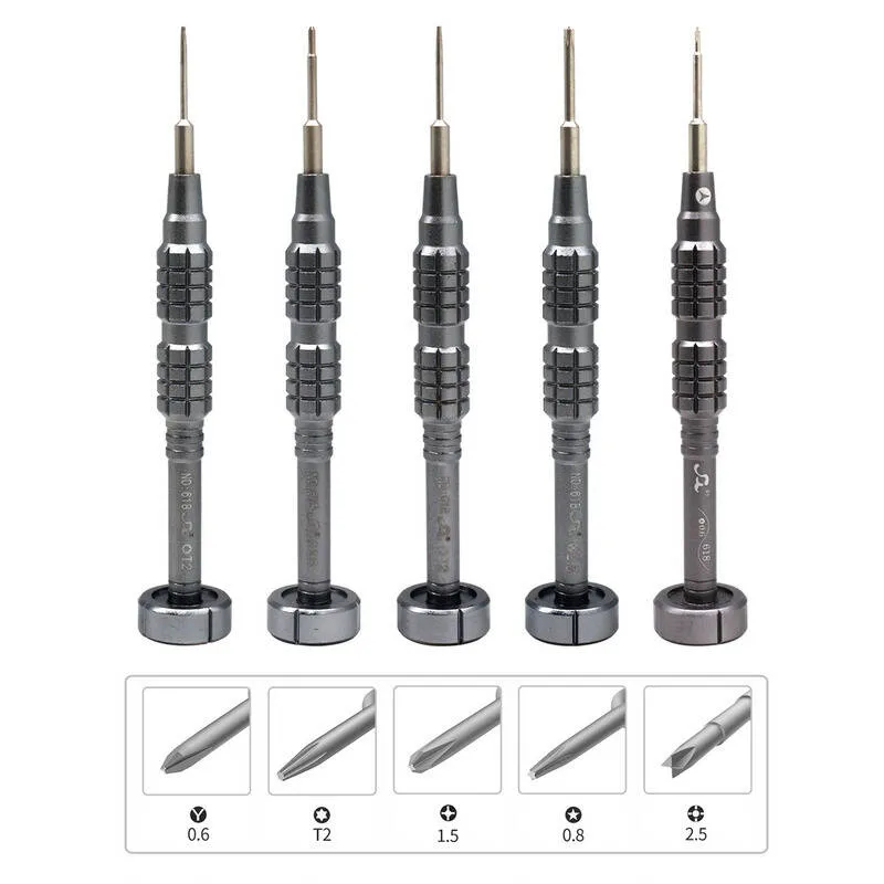 مفك بست SW-618 صُمّم لاحتياجات صيانة الهواتف والأجهزة الإلكترونية الدقيقة. تتوفر المجموعة بخمسة رؤوس تغطي معظم سيناريوهات التفكيك والتركيب: نجمة 0.8 (Pentalobe P2)، صليبة (+) 1.5 (Phillips)، Y 0.6 (Tri-Point)، مُسطّح 2.5 مم، وTORX T2. لذلك ستجد أداة مناسبة لكل خطوة، بدءًا من الفتح الأولي وحتى التجميع النهائي.
